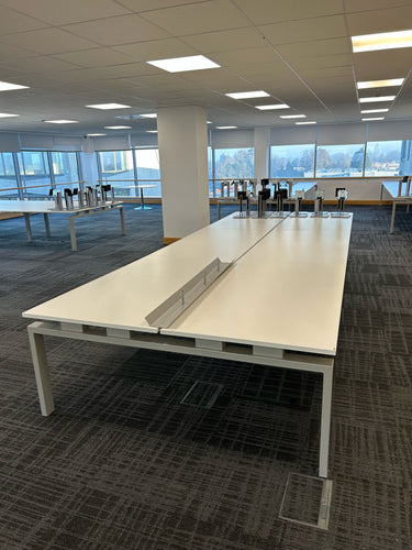 Each desk size is 1600mm x 800mm in banks of 6 or 8 desks, finished in White with silver metalwork, with shared cable baskets. In very good condition. We have 160nr units.