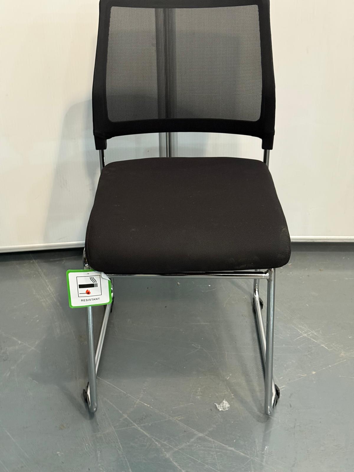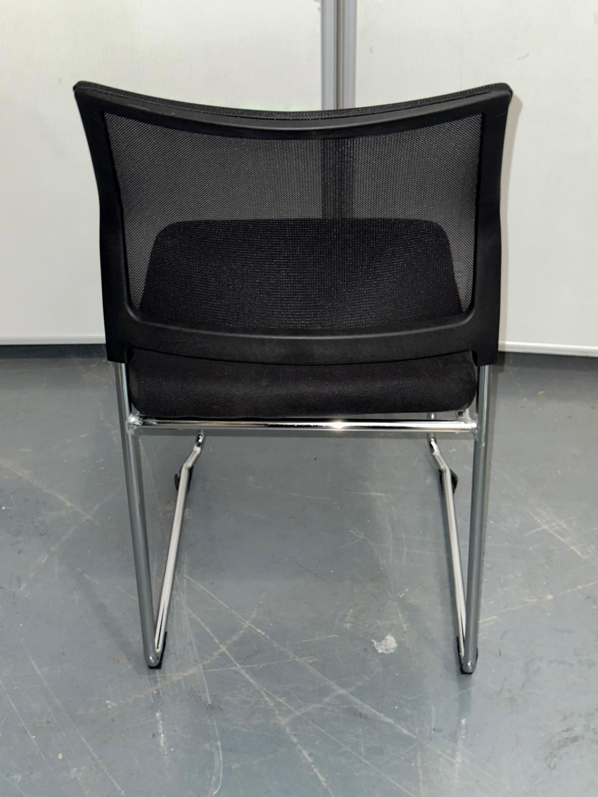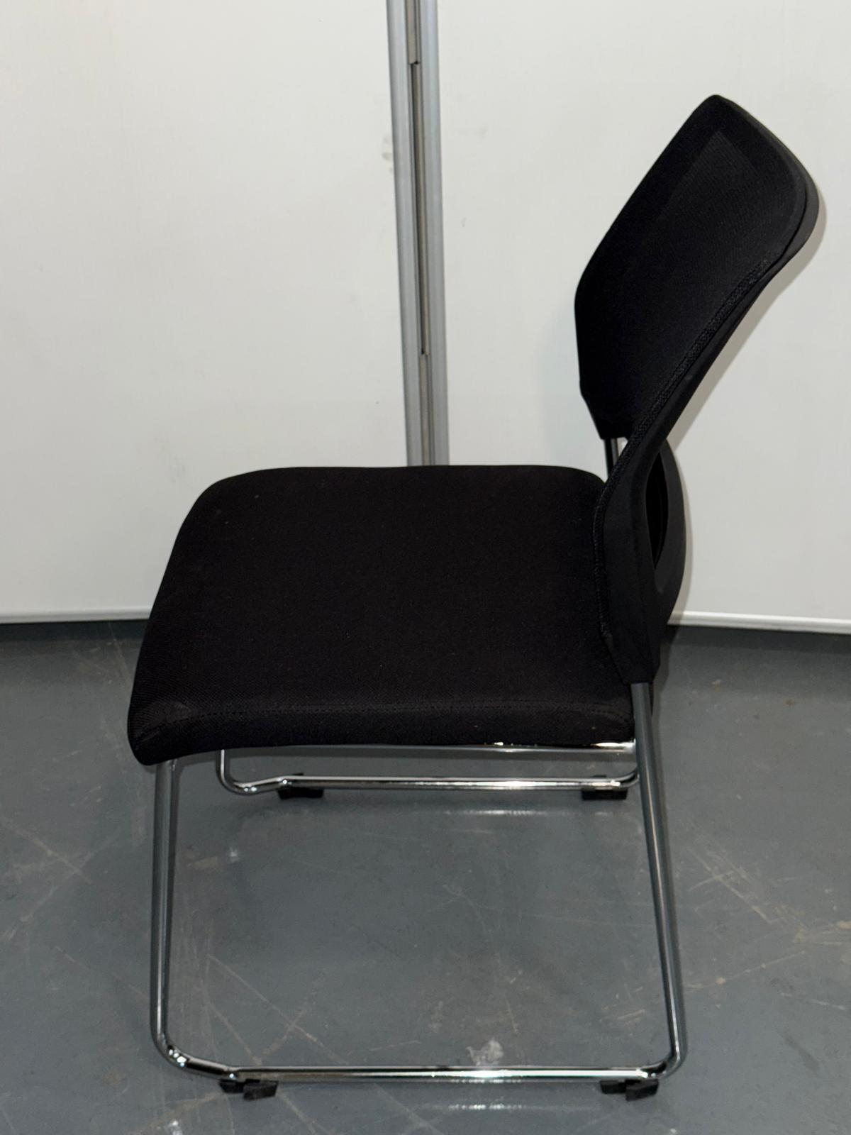 A modern black mesh-back chair with a cushioned seat and sturdy chrome sled base—perfect for meeting rooms, conference spaces, reception areas, and training environments. Comfortable, durable, and stackable for maximum versatility.