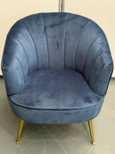 A luxurious velvet accent chair in rich blue, featuring a chic scallop-shell back, plush cushioning, and elegant gold metal legs. Perfect for adding comfort, sophistication, and a touch of glamour to any space.