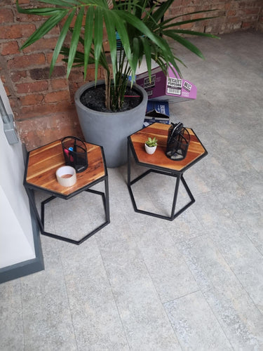 The scene features two matching hexagonal coffee tables with a warm wooden top and a sleek black metal frame. The tabletops showcase a natural wood grain that adds warmth and texture, while the geometric metal base gives the tables a modern, industrial look. £20 each table