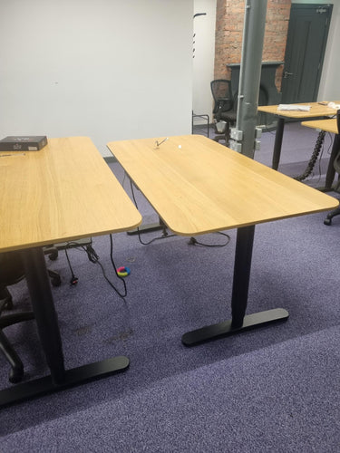 We have Ikea electrically height adjustable desks available, 1200mm x 800mm, with Light Oak top black frame work, height range 650mm to 1080mm aprox. with 10nr in-stock.