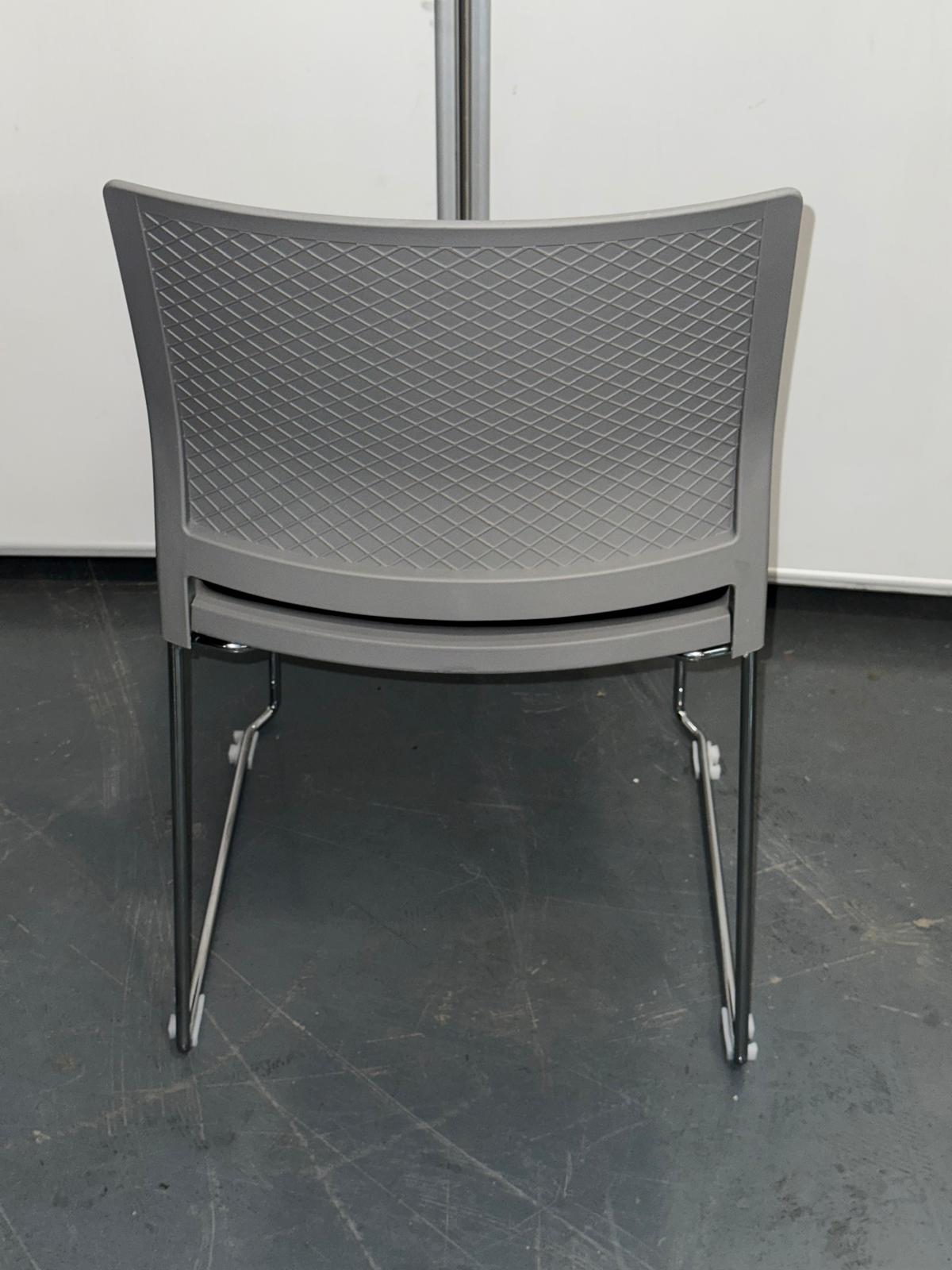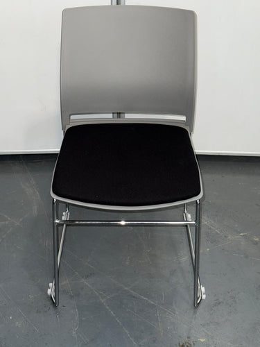 A modern grey and black sled-base meeting chair featuring a ventilated plastic backrest, thick padded seat, and strong chrome frame. Stackable, durable, and comfortable—ideal for offices, training rooms, reception areas, and high-use environments.