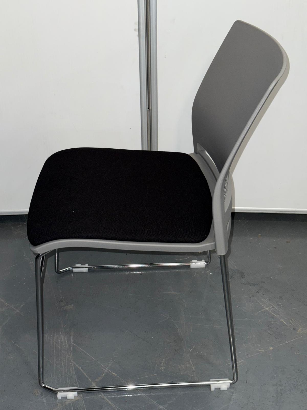A clean, modern colour scheme (grey back, black seat, chrome frame) blends seamlessly into corporate, educational, and hospitality environments.