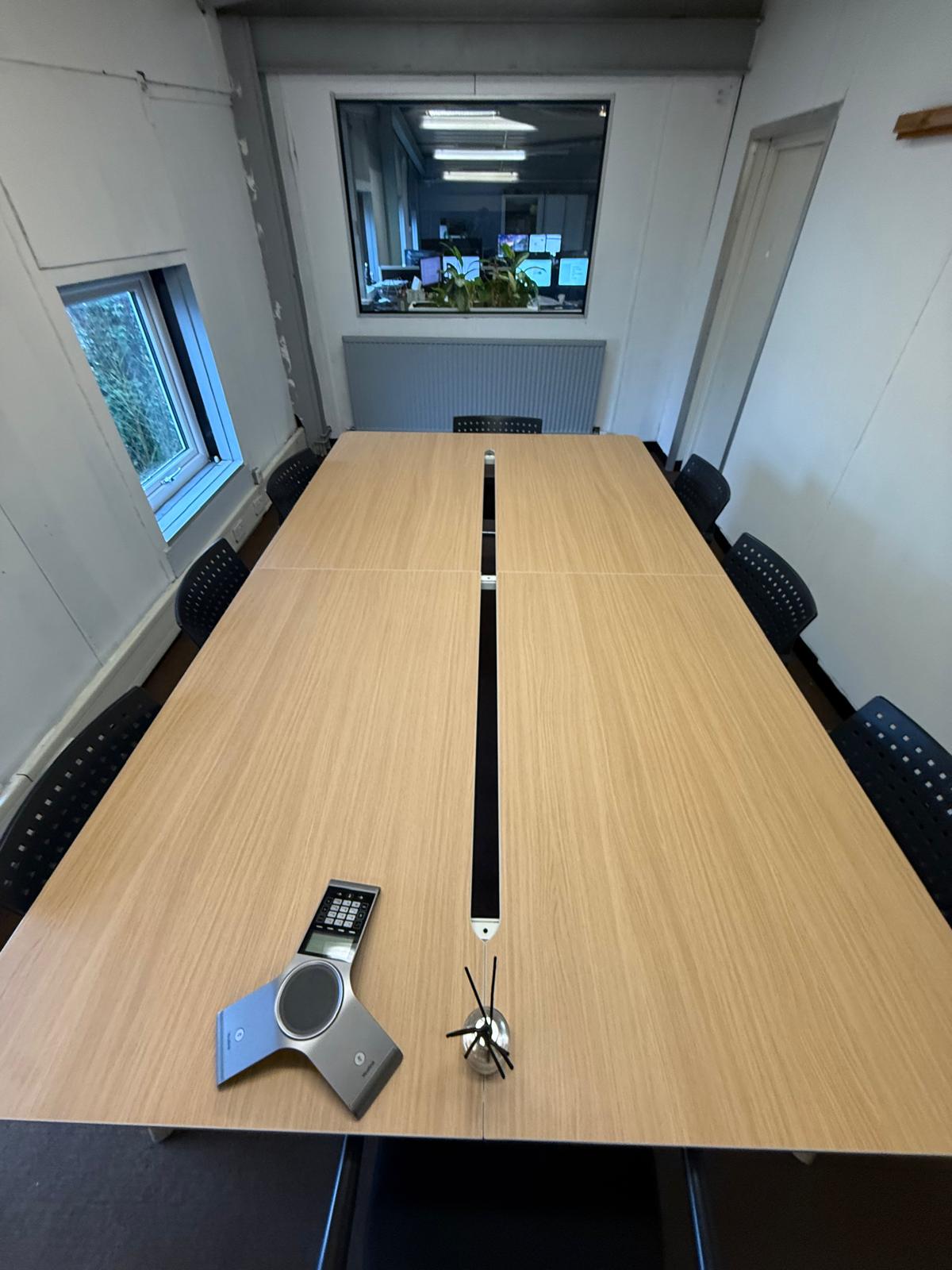 The warm oak finish brings a natural, welcoming feel to the room, while the integrated central cable management channel ensures a clutter-free workspace for laptops, screens, and devices.