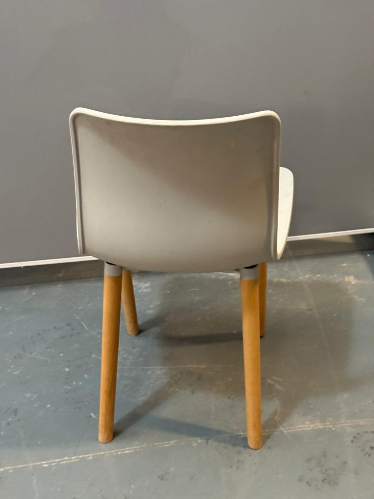 The seat is supported by four sturdy natural wooden legs, offering excellent stability while adding a warm, organic contrast to the white shell. The tapered leg design enhances the chair’s modern aesthetic while ensuring strong, long-lasting support for daily use. Lightweight and easy to move, this chair is ideal for versatile seating arrangements and dynamic spaces.