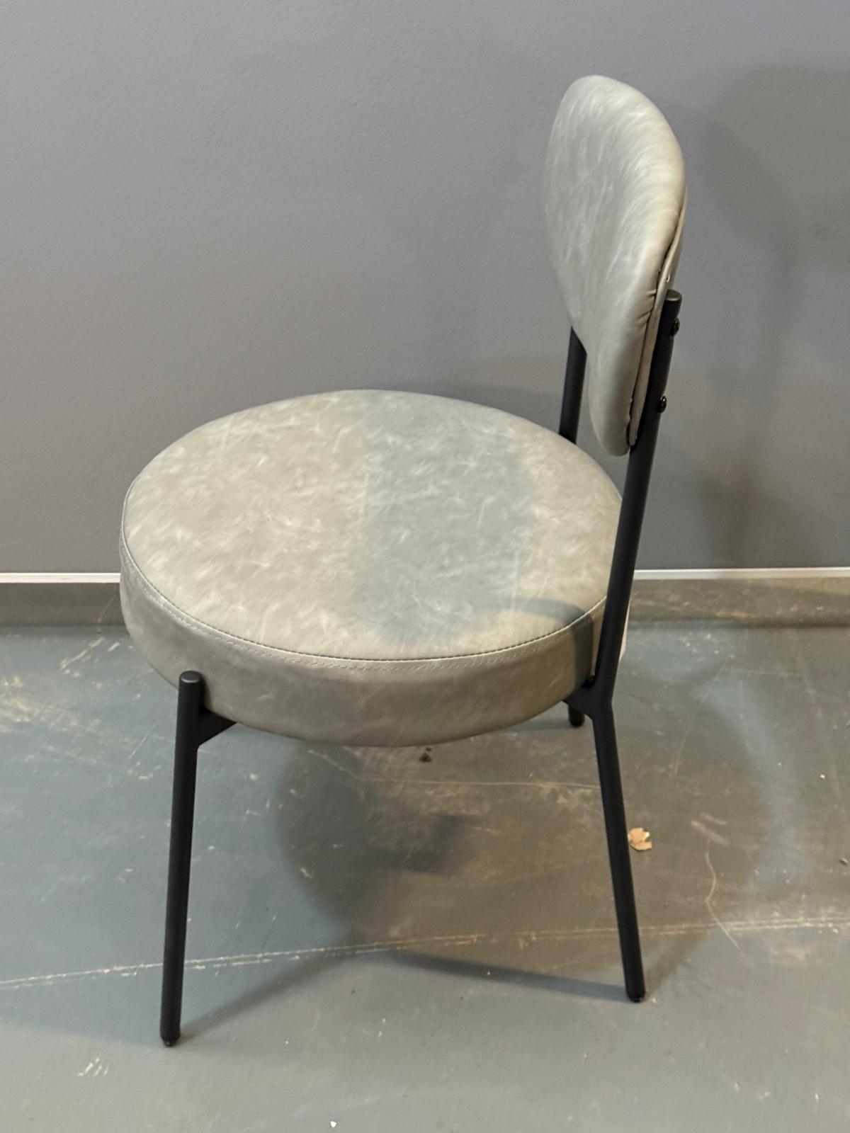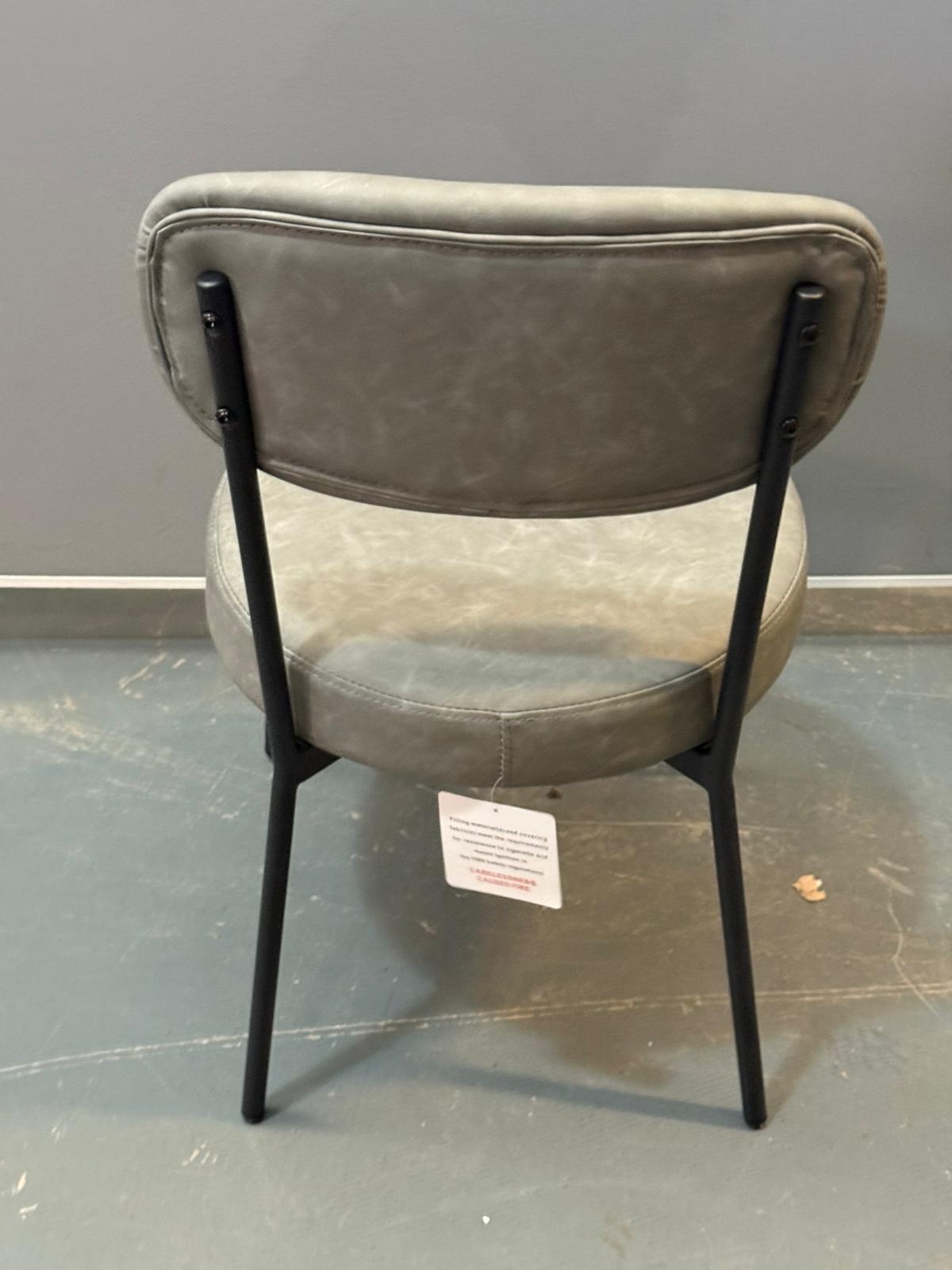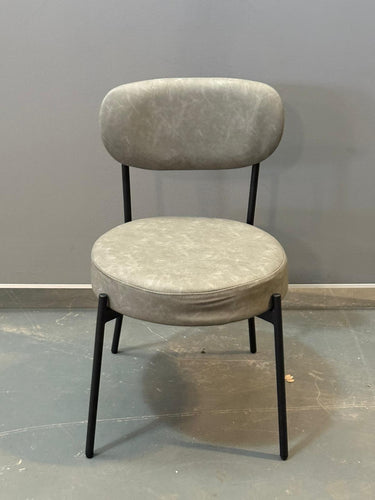 Introducing a sleek and contemporary grey faux-leather side chair designed to elevate any dining, reception, office, or hospitality space. This stylish chair features a rounded backrest and a fully cushioned circular seat, both upholstered in a smooth, marbled grey faux leather that adds a modern, upscale touch. Supported by a black powder-coated metal frame with slim, angled legs, it offers a perfect balance of comfort, durability, and visual appeal. Ideal for both commercial and home environments, this chair brings understated elegance to any setting.
