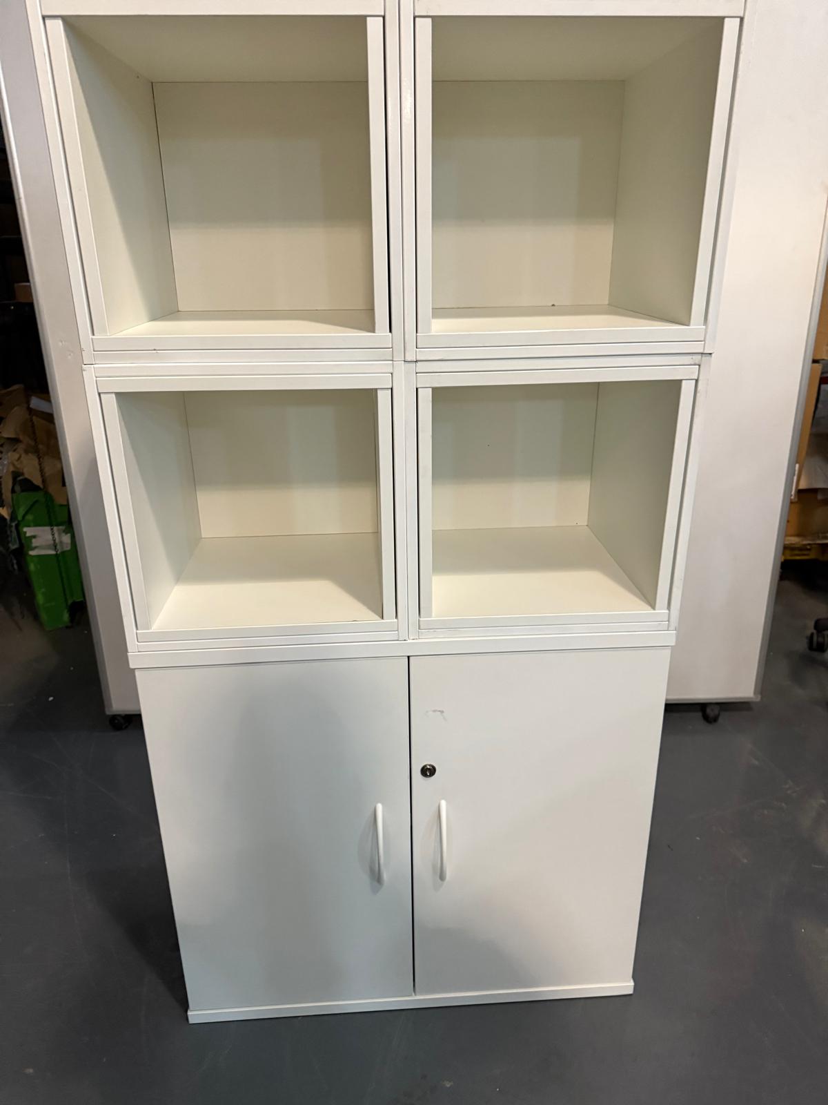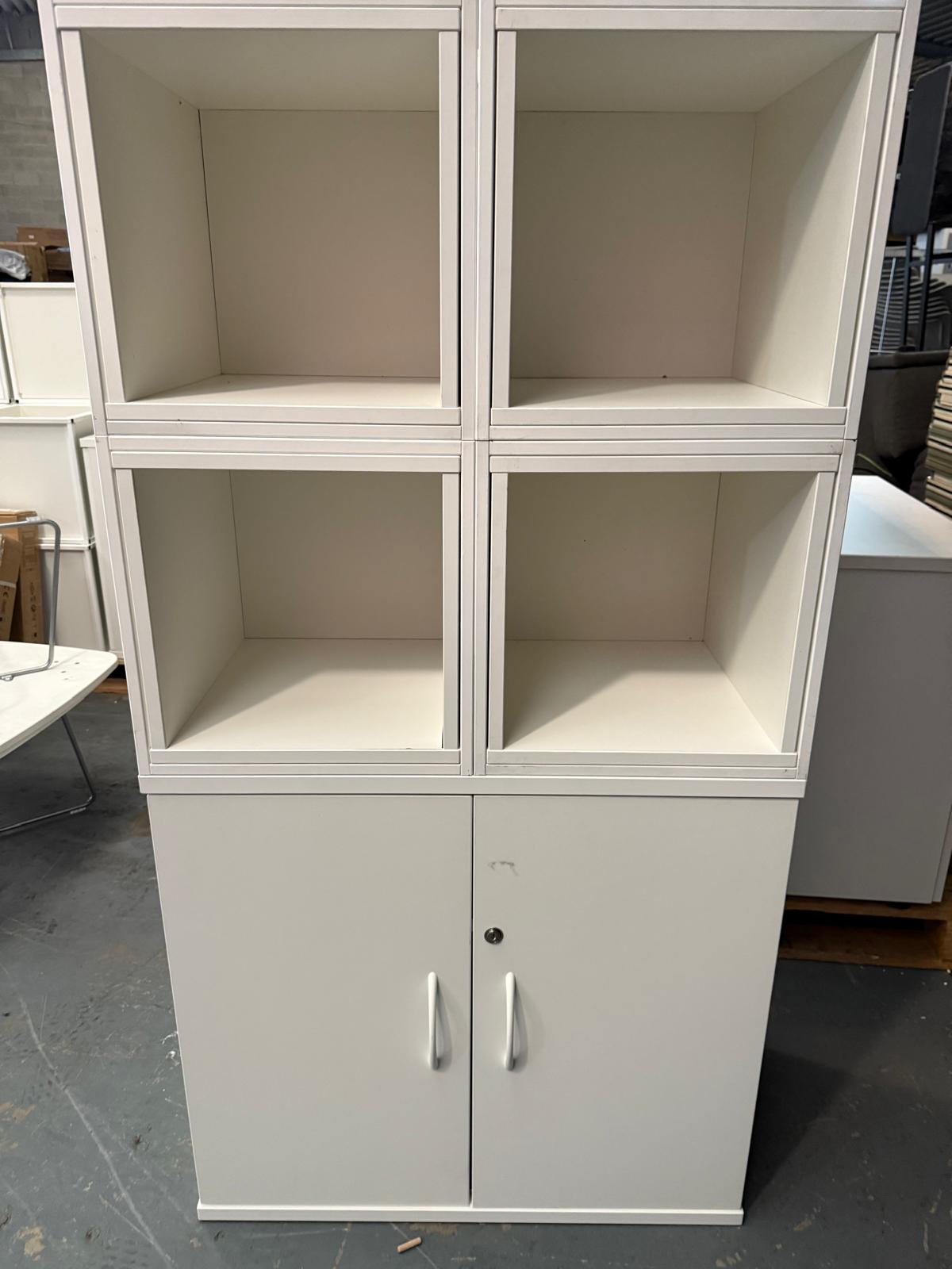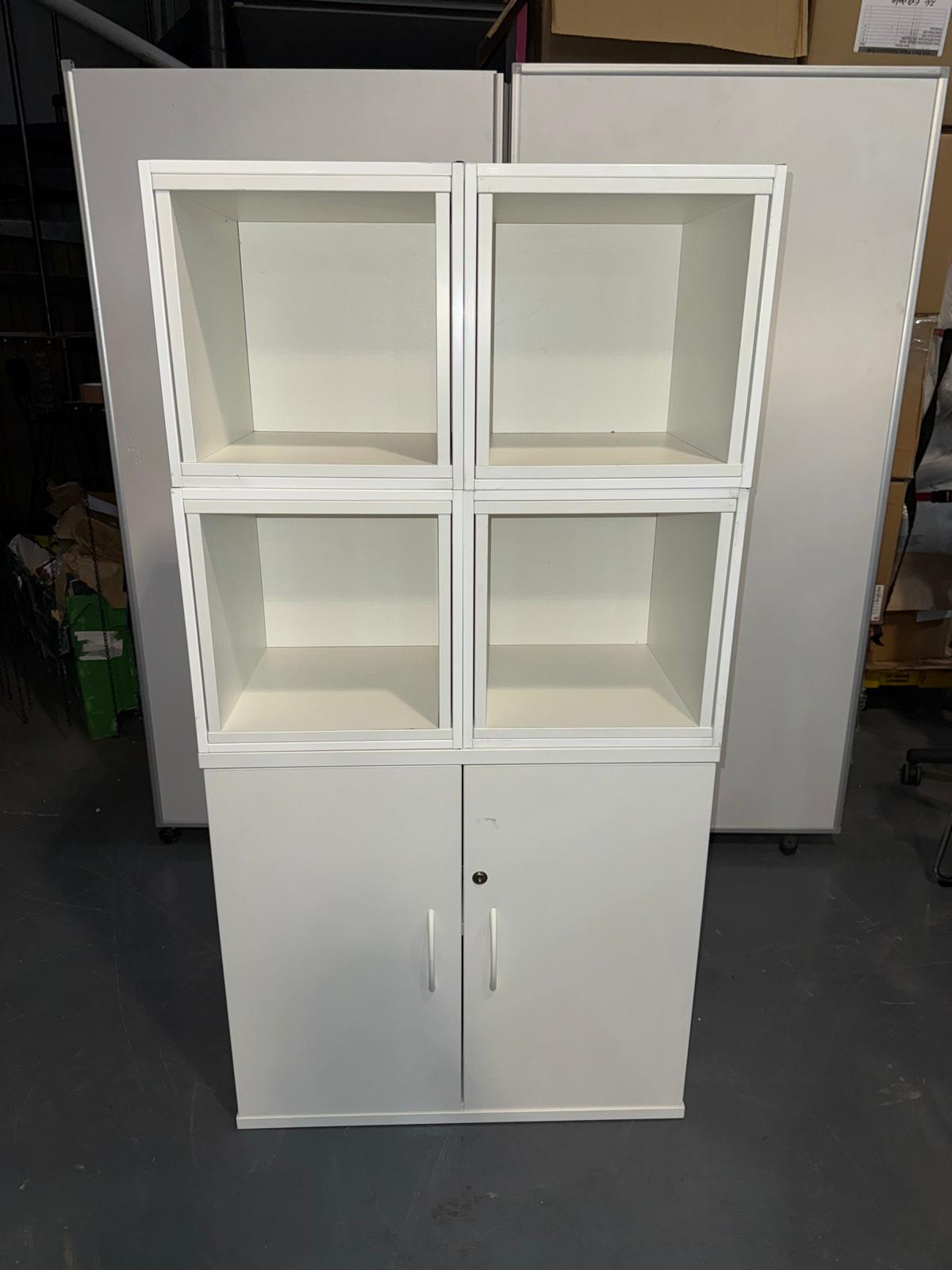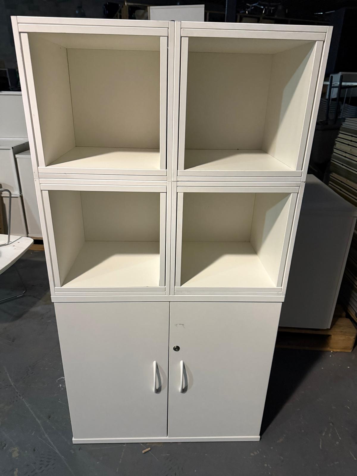 A stylish and practical modular storage cabinet featuring four open display cubes and a secure double-door lower compartment. Ideal for organisations seeking clean aesthetics, efficient storage, and durability.