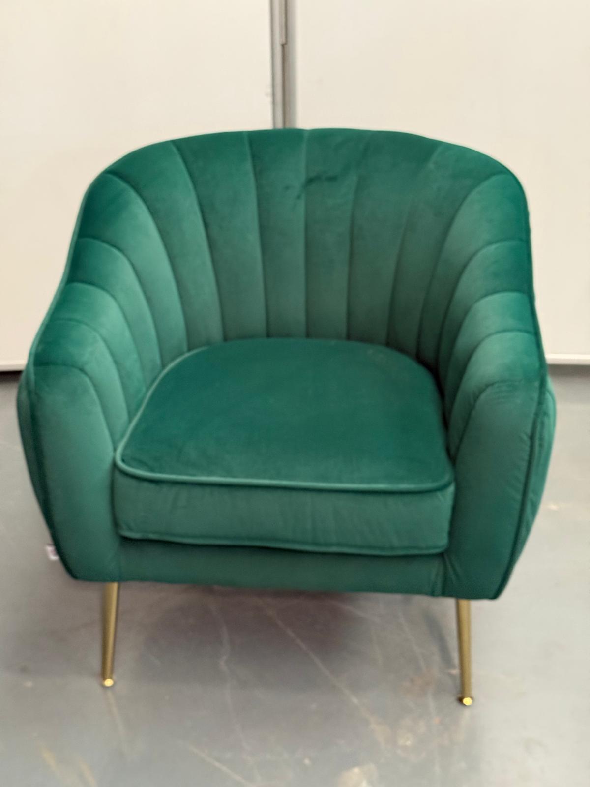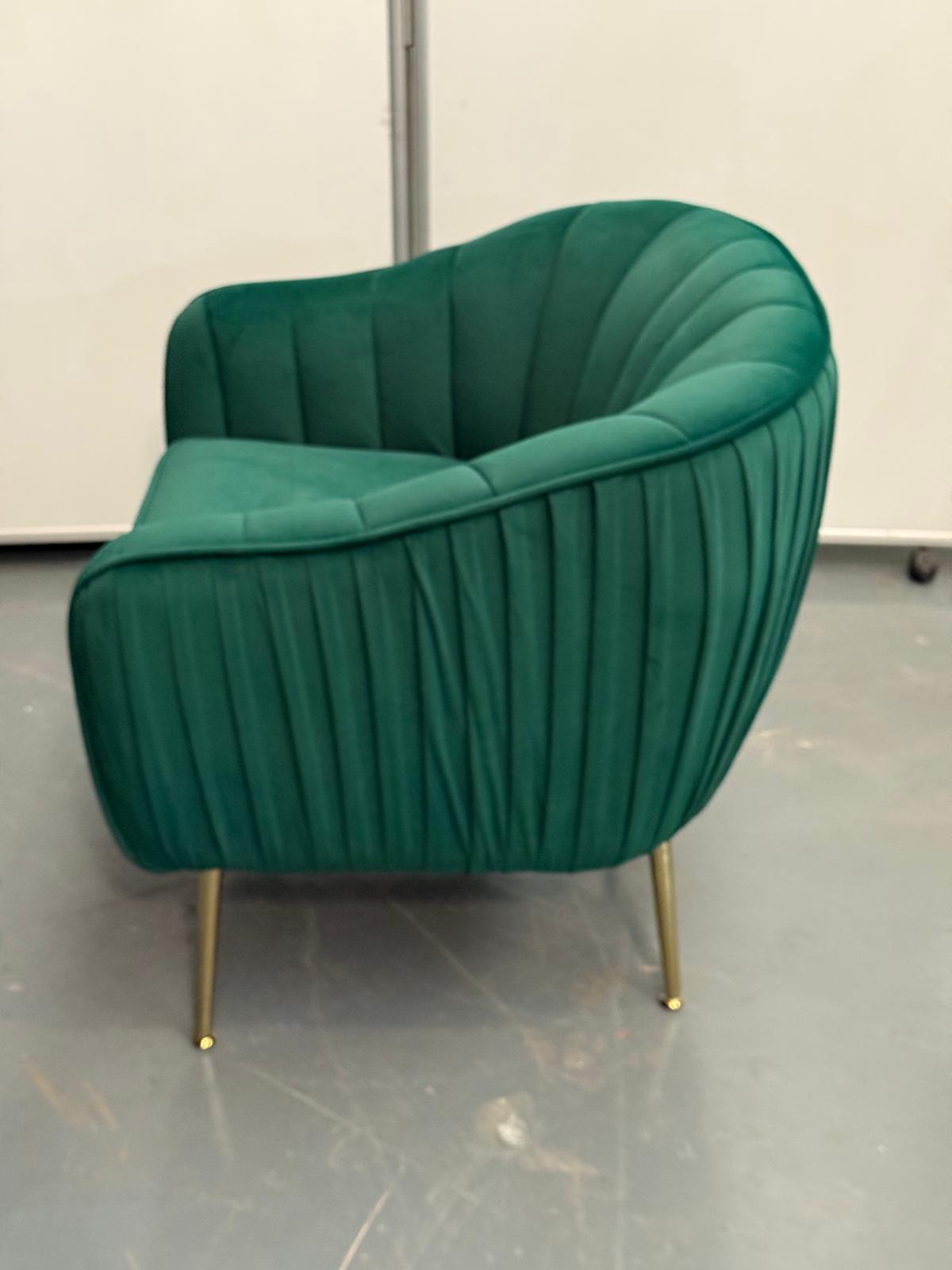 A luxurious emerald green velvet accent chair featuring a pleated shell design and sleek gold metal legs. Stylish, comfortable, and designed to impress—perfect for any space seeking a touch of modern luxury.