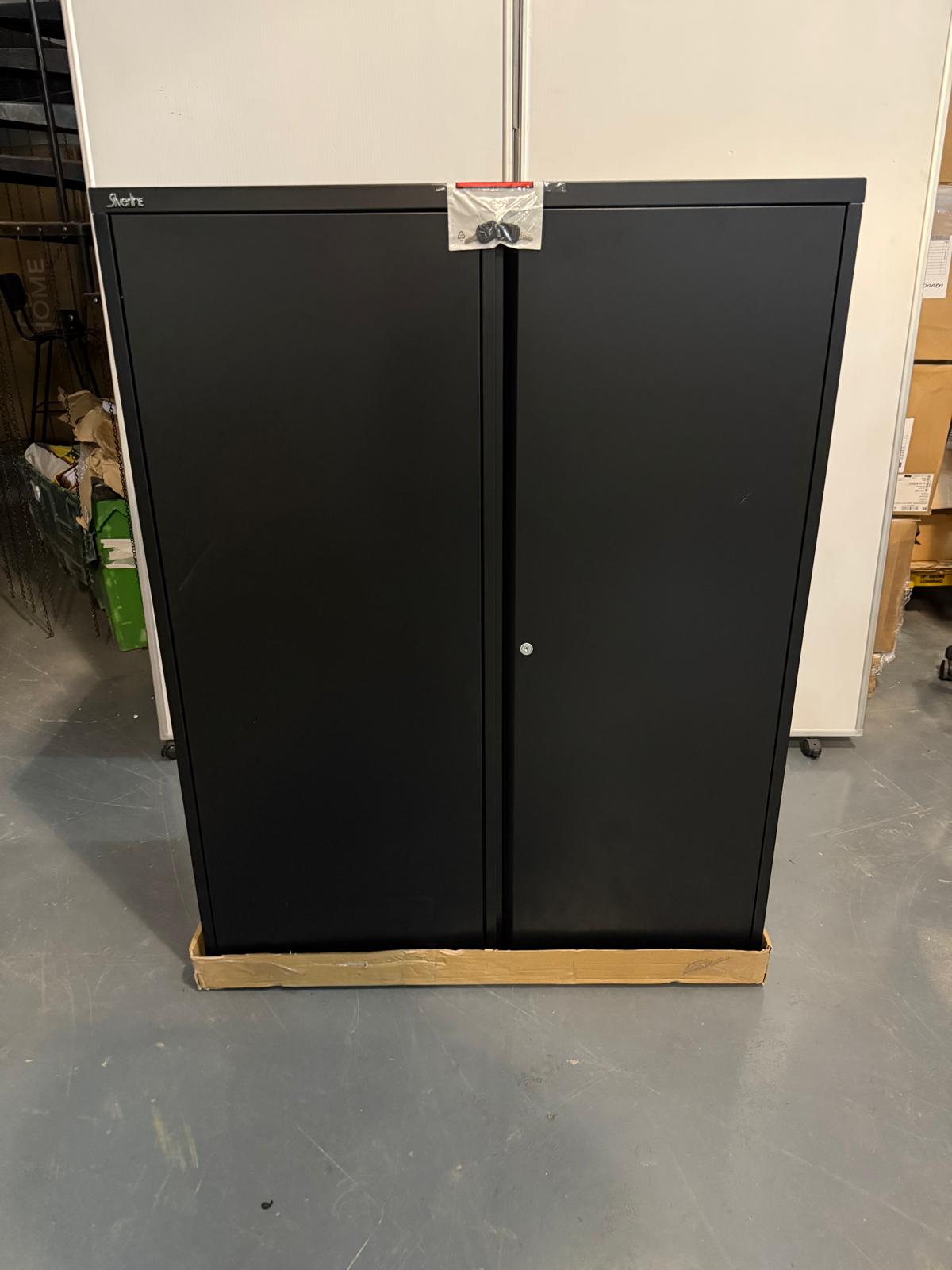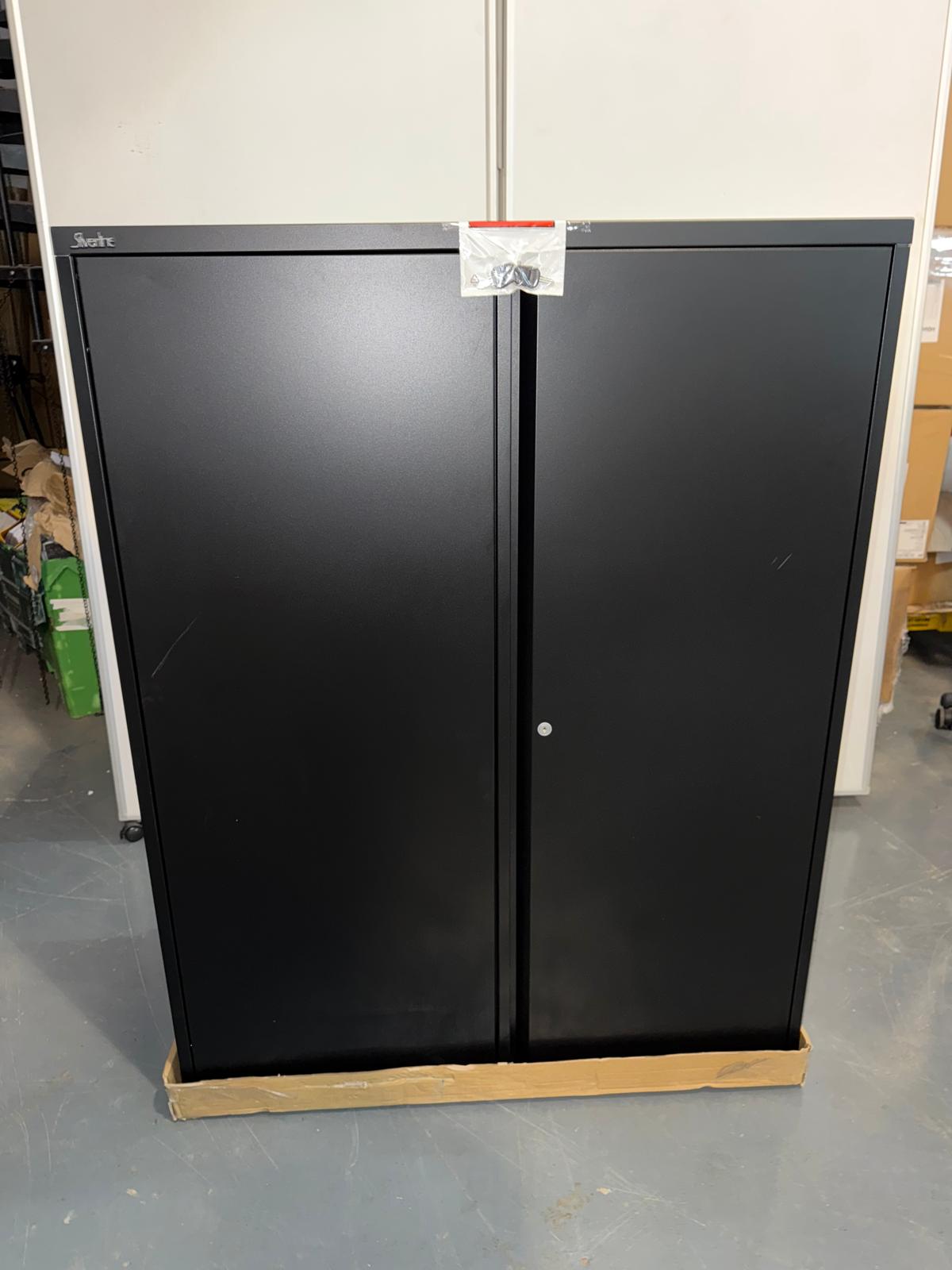Finished in a smooth, matte black powder-coat, the cabinet adds a refined touch to offices, studios, workshops, and commercial spaces. With a full-height twin-door design, this cabinet provides generous internal storage while maintaining a slim, space-efficient footprint.